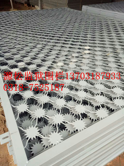 唐山監獄圍欄網采用Y型立柱、框架型太陽花刺網 、顏色采用大氣的灰色、先鍍鋅在進行噴塑防腐處理,具有很好的抗老化、抗曬、耐氣候等特點。其產品造型美觀、花色獨特新穎,既起到圍欄作用,又起到美化作用。監獄圍欄規格:高3.5米X 2.5米 (中對中2.5米含2個對開門) 立柱:10X10 方管 壁厚2.75 邊框角鐵40X40 法蘭盤直接安裝在墻頭上用膨脹螺絲固定:規格200X200 四個厚、監獄圍欄頂部加裝刀片刺網、加強安全防御性能、安全性高、防攀爬效果更強。