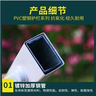 pvc塑鋼護欄花池草坪小柵欄結構特點;pvc塑鋼護欄由橫梁,豎桿,立柱等幾大部分組成,橫梁表面為pvc內部有鋼管內襯,豎桿為pvc材質,立柱內部也有內襯,這種護欄有塑料與鋼結構組成,所以稱為塑鋼護欄,pvc塑鋼護欄,這種護欄兼顧鋼材的強度和pvc的美觀特性,表面光潔,耐腐蝕,不褪色,色彩亮麗,稱為最具裝飾效果的精品小柵欄,pvc塑鋼護欄高度30-180cm/橫桿尺寸一般為36*56cm/立桿20*46cm/立柱58*78cm/88*88cm/121*121cm;立桿間距16cm/長度一般3.08m/套。